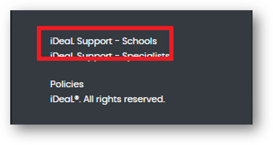 However, while the Helpdesk Support feature is located in the iDeaL Startup area, there is a link to this on every page in iDeaL. When you need help, just scroll to the footer at the bottom of any page and click on the 'iDeaL Support - Schools' link. The Helpdesk feature will open in a new tab for you to search articles or submit a ticket.