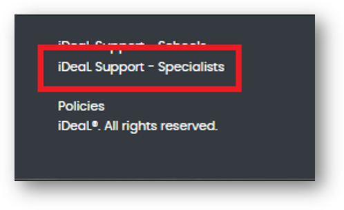 However, while the Helpdesk Support feature is located in the iDeaL Start-Up area, there is a link to this on every page in iDeaL. When you need help, just scroll to the footer at the bottom of any page and click on the 'iDeaL Support - Specialists' link. The Helpdesk feature will open in a new tab for you to search articles or submit a ticket.